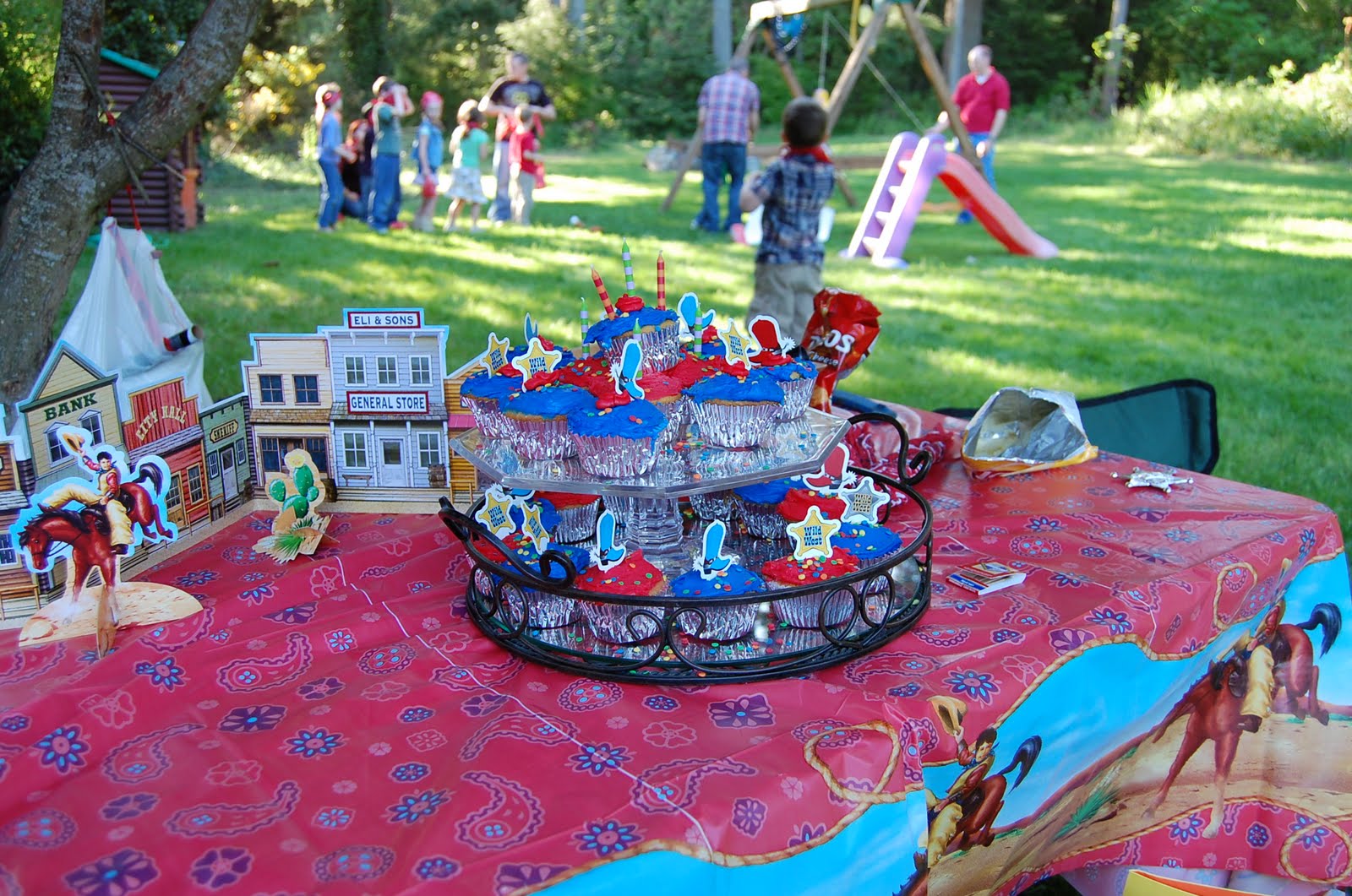 We even had a swooping visit by a bald eagle through our trees. Seems we sparked the interest of him! Our games consisted of "Lasso the Rocking Horse (with hula hoops)", Pin the badge on the sheriff, Cowboy pinata and a Stick Horse relay where kids earned their sheriff badges and red bandanas.